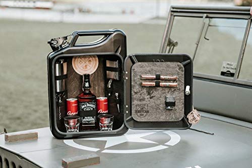 De minibar voor echte kerels BELANGRIJK: wij mogen geen dranken en geen tabaksproducten leveren. Je ontvangt de jerrycan dus zonder de afgebeelde alcohol, zonder cola en zonder de sigaren. Bevat: Flachmann 220 ml sigarettenetui voor 20 sigaretten 2 glazen Casablanca 210 ml flesopener flessenstop inschenker benzineaansteker kleur en binnenmateriaal De jerrycan is zwart gelakt. Binnenin is hij bekleed met donker beukenhout. Ruim met houders. De ruimtelijke mogelijkheden van onze bar maken het mogelijk om alles wat nodig is voor een geweldige ervaring met je vrienden erin op te bergen en te bevestigen. Bovendien is de jerrycan afsluitbaar. Handgemaakt en 100% milieuvriendelijk. Deze draagbare bars zijn met de hand gemaakt. Wij gebruiken 100% natuurlijke kleurstoffen en letten op een milieuvriendelijk productieproces.