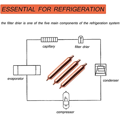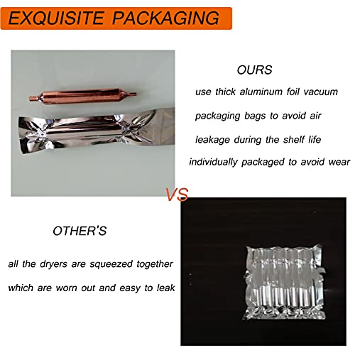 EXTREEM HOGE KWALITEIT: Het koperen buisdrogerfilter is gemaakt van hoogwaardige koperen buis door cirkelboogspinnen, ingebouwde moleculaire zeef om water te absorberen en te drogen, en filters zijn aan beide uiteinden geïnstalleerd. De kwaliteit van de filterdroger heeft een directe invloed op de levensduur en het bevriezingseffect van het koelsysteem