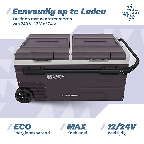 De Bluefin Active Ice Cache 95L Draagbare Koelbox is onze meest compacte draagbare compressor koelbox. De elektrische koelbox beschikt over geavanceerde koel- en vriestechnologie en dubbele opbergvakken met hun eigen onafhankelijke temperatuurregeling, zodat de Ice Cache 95L je etens-en drinkwaren in één en hetzelfde toestel kan koelen en invriezen. De temperatuurinstellingen van de mini koelbox variëren van -20 tot 20°C, zodat je favoriete etenswaren en dranken altijd veilig en vers blijven, waar je ook bent. Professioneel ontworpen en bestand tegen extreme temperaturen van -20 tot 50°C; de Ice Cache 95L is geschikt voor elk klimaat. Met zijn uitschuifbare handgreep en stevige wielen kun je de koelbox trolley makkelijk verplaatsen. Pas de temperatuur aan en controleer het stroomverbruik van de Ice Cache 95L via de geïntegreerde smartphone app. Maak je geen zorgen over je etens- en drinkwaren, je kunt de bedieningselementen van de koelkast onderweg wijzigen met een paar snelle tikken in de app. De Ice Cache 95L kan snel opgeladen worden met de AC/DC energiezuinige oplaadkabel. De koelbox wordt ook geleverd met een flexibele kabel waarmee je de compressor koelbox zowel thuis als vanuit je auto kunt opladen. De gespecialiseerde batterijbeveiliging schakelt het toestel uit als de spanning laag is. Ontdek de extra functies: een ingebouwd LCD-scherm voor eenvoudige temperatuuraanpassing, een USB-oplaadpunt en ECO- (energiebesparende) en MAX-modi (snel koelen) voor eenvoudig gebruik. — In de doos — ➜ Bluefin Active Ice Cache 95L draagbare koelbox ➜ Handleiding ➜ Gereedschapskit ➜ EU-adapter ➜ Britse voedingsadapter ➜ Autoadapter voor meerdere stopcontacten —– Belangrijkste kenmerken —– ✓ Smartphone App-bediening ✓ Dubbele compartimenten ✓ LCD-scherm ✓ Compact ontwerp 976 x 572 x 528 mm ✓ Temperatuurbereik: -20 tot 20 ° C ✓ Uitschuifbare handgreep en stevige wielen ✓ Energiebesparend opladen ✓ Gewicht 28kg